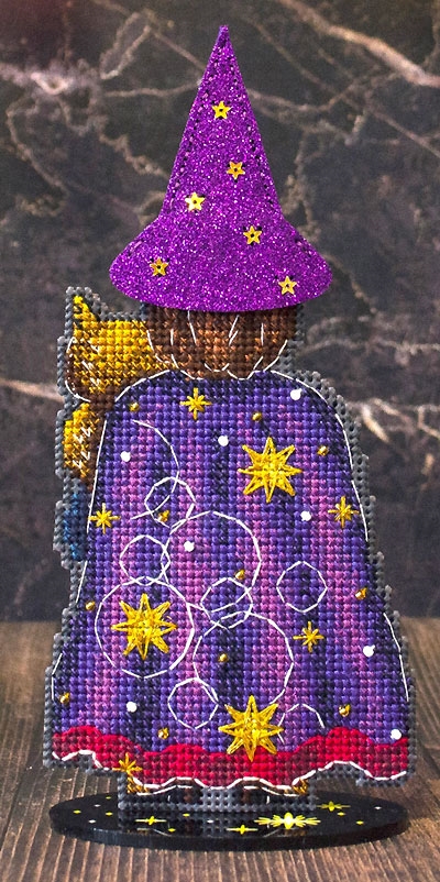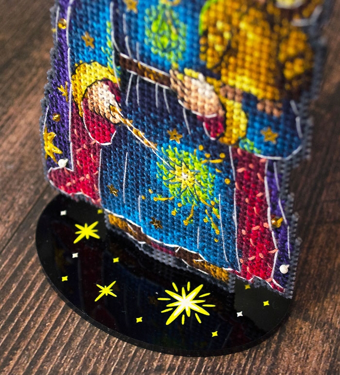 В состав набора входят: хлопковое мулине ПНК им. Кирова 21 цвета, пластиковая канва темно-серого цвета, бисер, подставка, звездные пайетки, декоративная шляпа из сверкающего фоамирана, игла, схема, инструкция.
