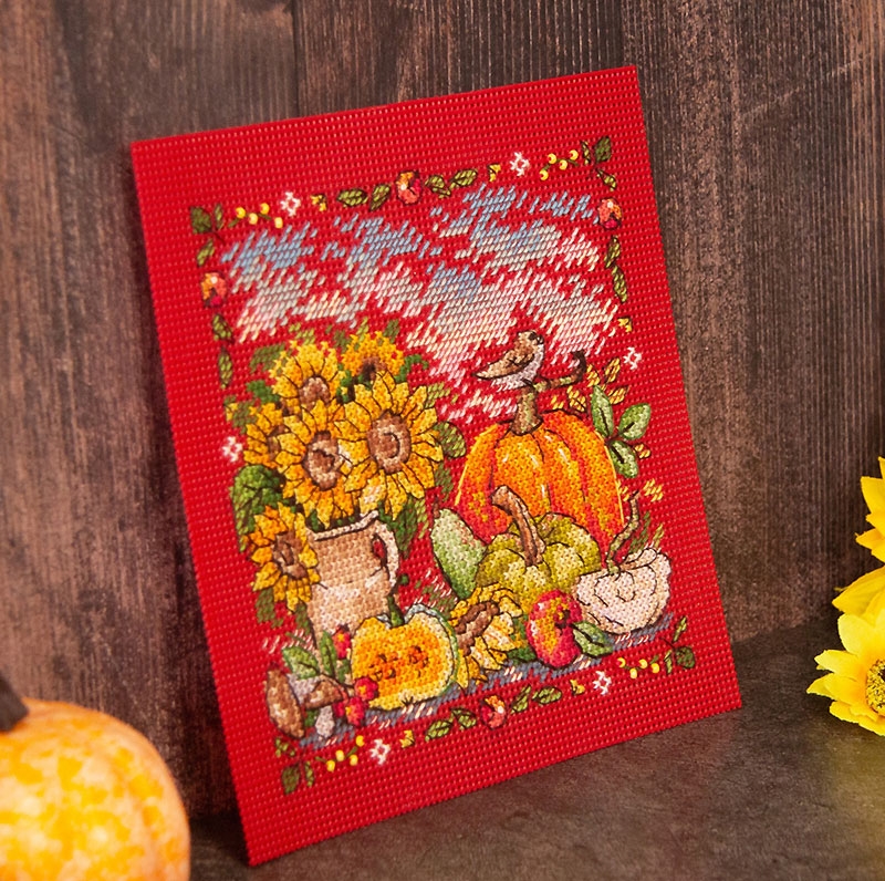 В состав набора входят: хлопковое мулине ПНК им. Кирова 32 цветов, пластиковая канва красного цвета, бисер, игла, схема, инструкция.