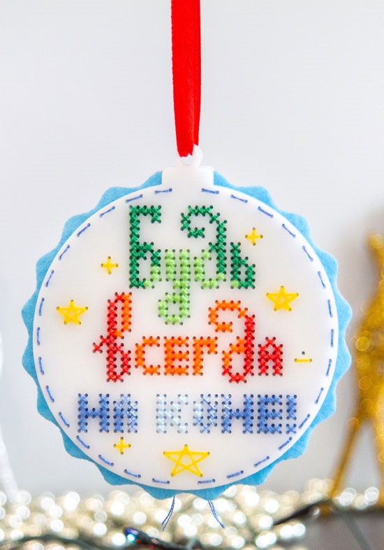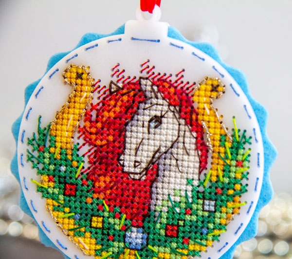 В состав набора входят: хлопковое мулине ПНК им. Кирова 21 цвета, акриловая основа с перфорацией, металлизированные нити, фетровое кружево, лента для подвеса, игла, схема, инструкция.