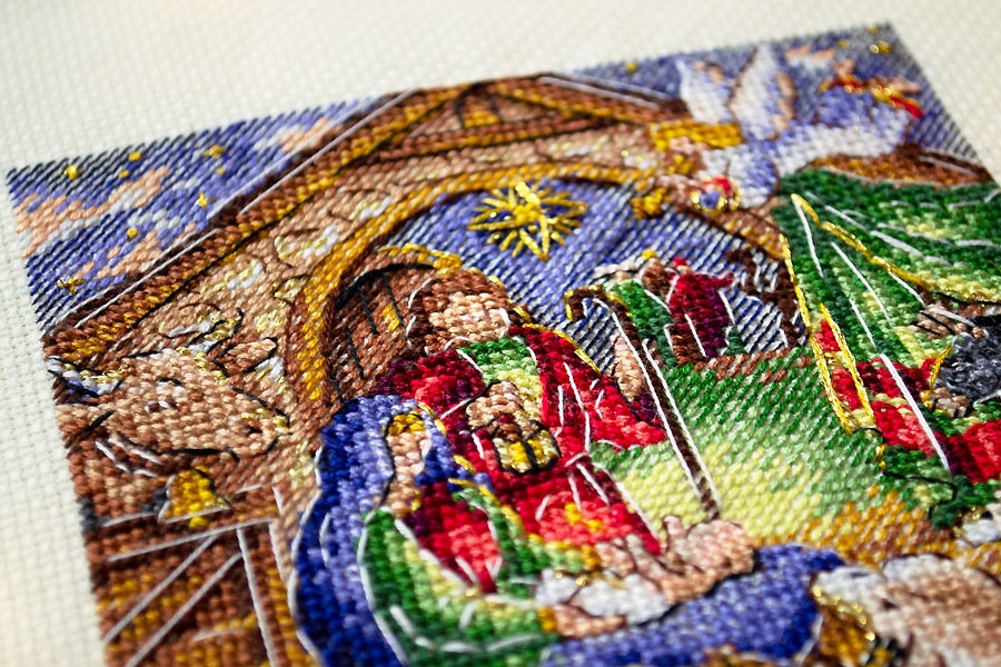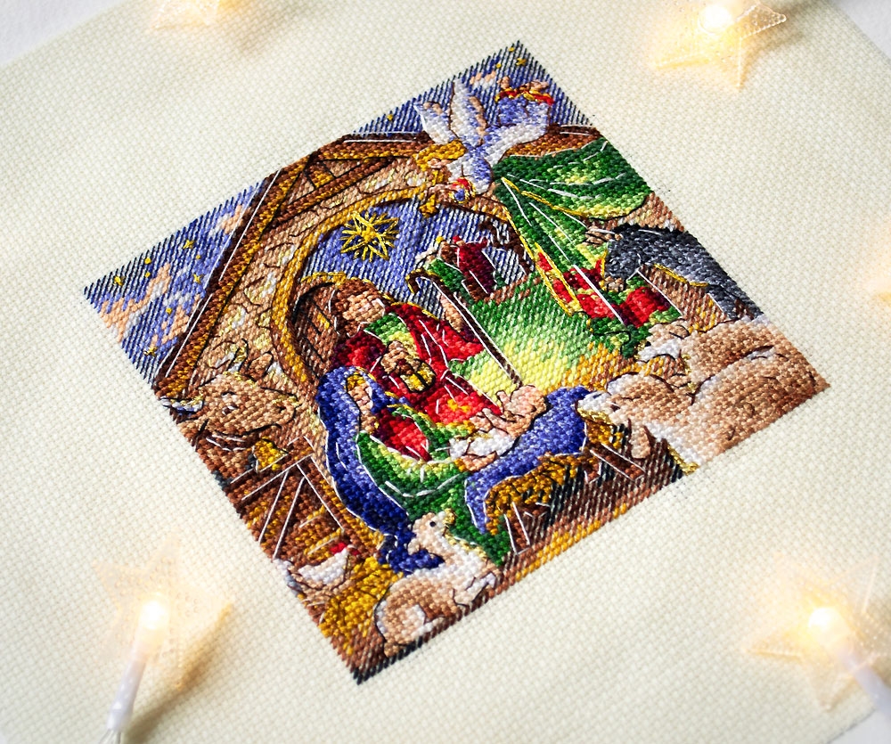 В состав набора входят: хлопковое мулине ПНК им. Кирова 27 цветов, аида 16 кремового цвета, металлизированные нити, игла, схема, инструкция.