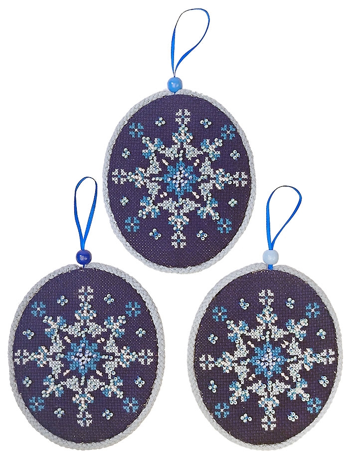 В состав набора входят: хлопковое мулине Finca 25 цветов, аида 18 серо-голубого цвета, аида 14 темно-синего цвета, бисер, шнур, лента, бусины, игла, схема, инструкция.