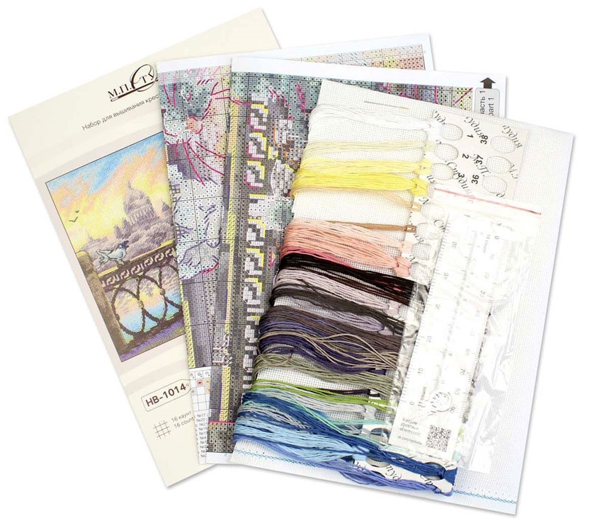 В состав набора входят: хлопковое мулине Gamma 30 цветов, аида 16 белого цвета, игла, схема, инструкция.