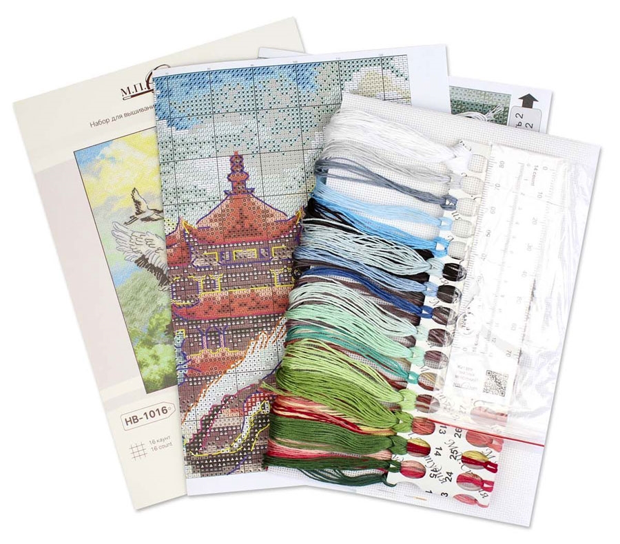 В состав набора входят: хлопковое мулине Gamma 33 цветов, аида 16 белого цвета, игла, схема, инструкция.