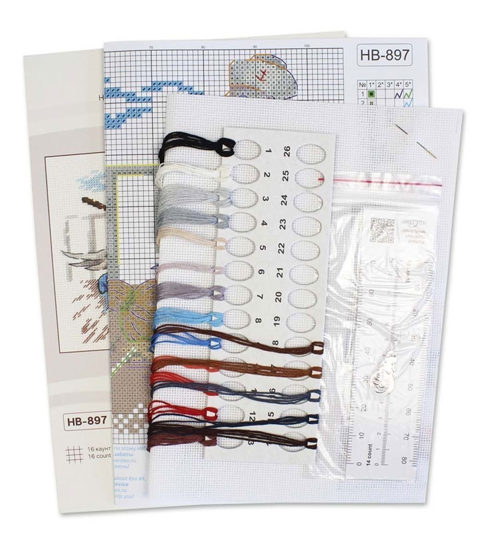 В состав набора входят: хлопковое мулине Gamma 18 цветов, аида 16 белого цвета, игла, схема, инструкция.