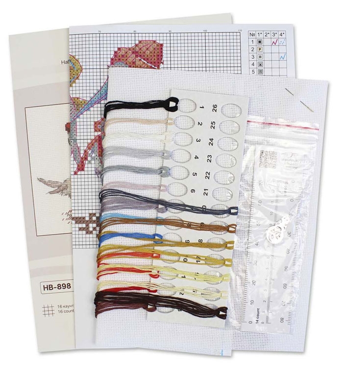 В состав набора входят: хлопковое мулине Gamma 20 цветов, аида 16 белого цвета, игла, схема, инструкция.