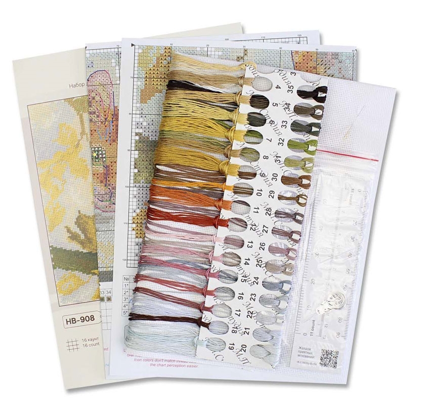 В состав набора входят: хлопковое мулине Gamma 35 цветов, аида 16 белого цвета, игла, схема, инструкция.