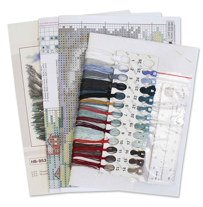 В состав набора входят: хлопковое мулине Gamma 25 цветов, аида 16 белого цвета, игла, схема, инструкция.