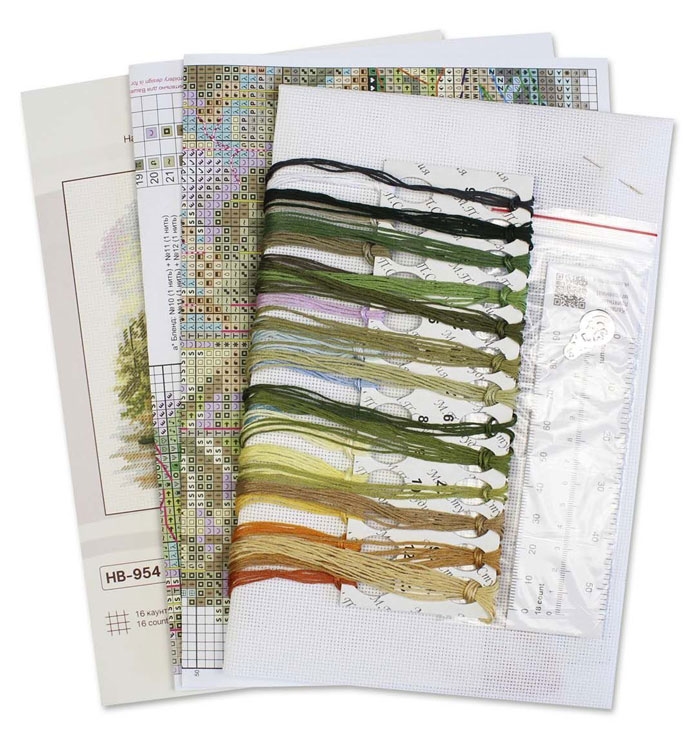 В состав набора входят: хлопковое мулине Gamma 26 цветов, аида 16 белого цвета, игла, схема, инструкция.