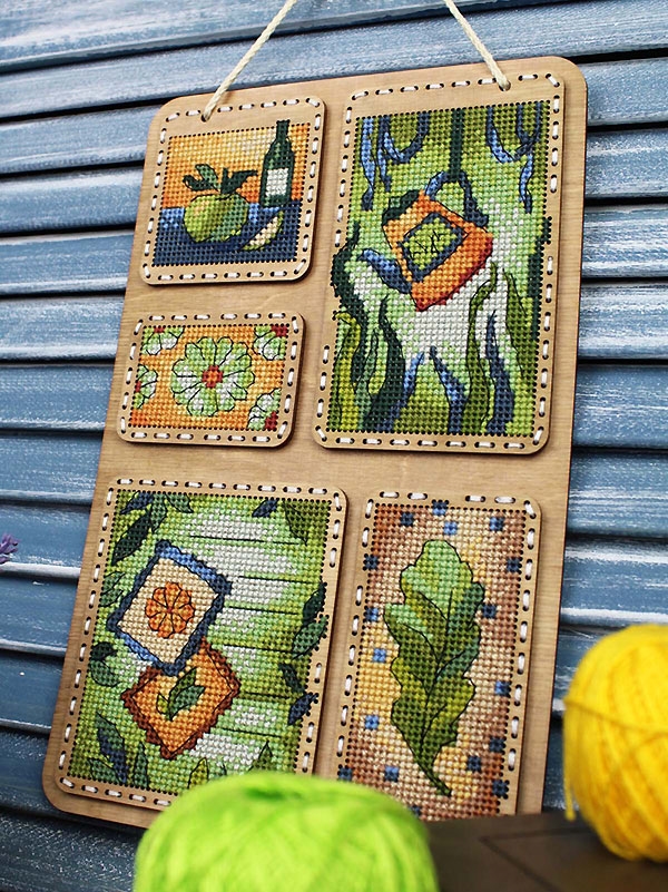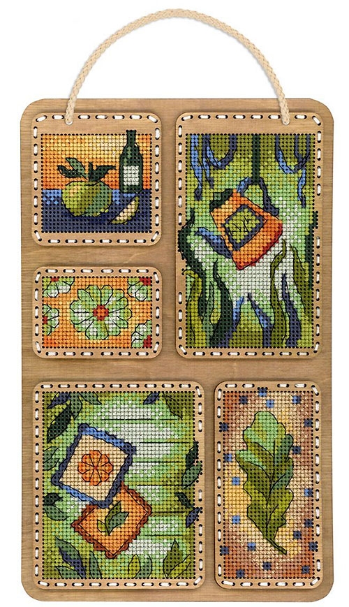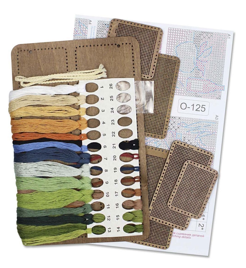 В состав набора входят: перфорированная заготовка (материал - фанера, толщина 4 мм), мулине ПНК им. Кирова 21 цвета, шнур, деревянный задник, схема, игла, инструкция.