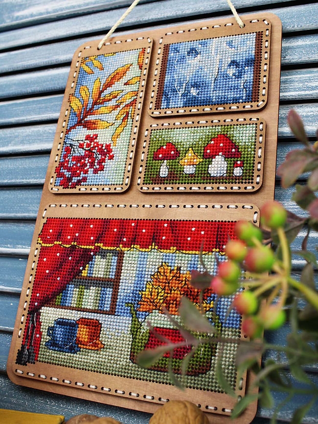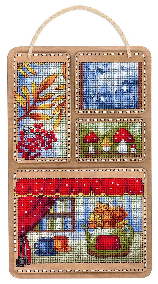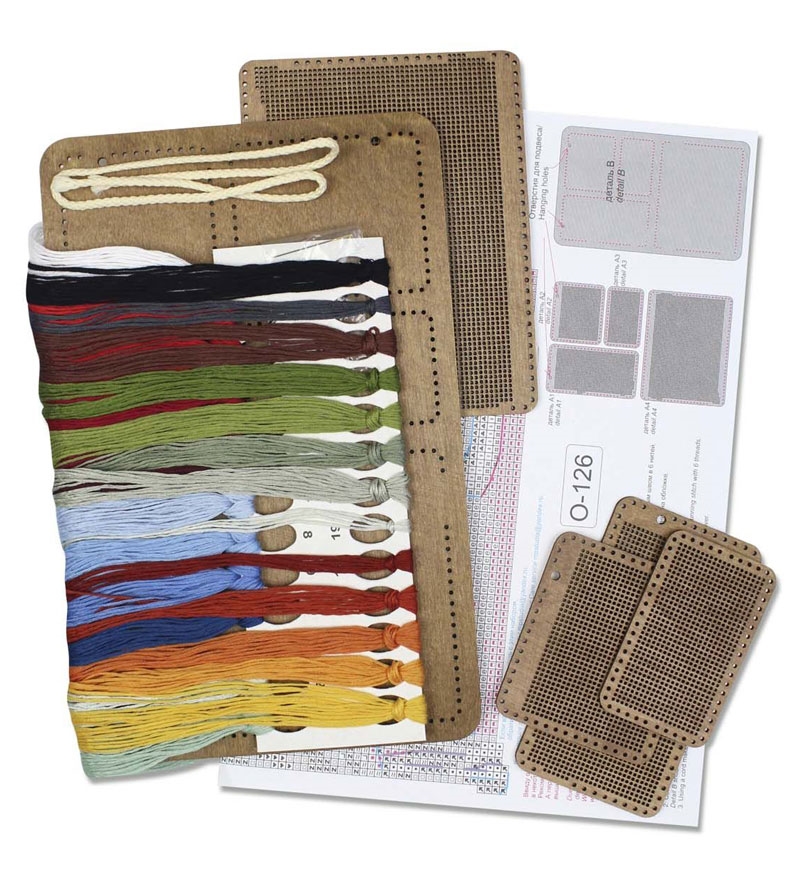 В состав набора входят: перфорированная заготовка (материал - фанера, толщина 4 мм), мулине ПНК им. Кирова 26 цветов, шнур, деревянный задник, схема, игла, инструкция.