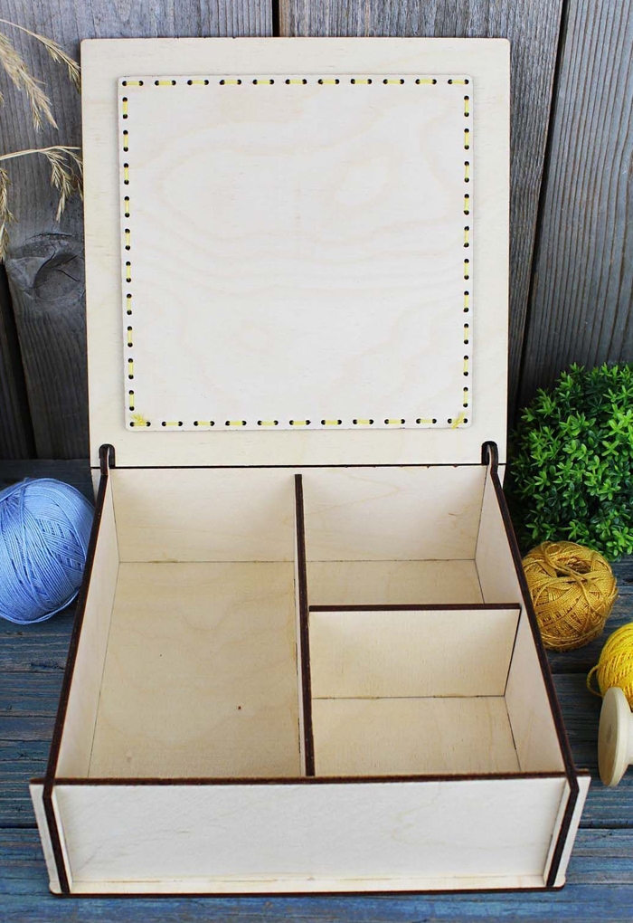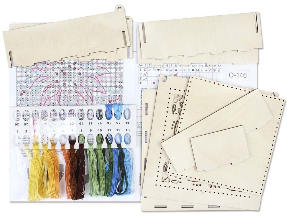 В состав набора входят: перфорированная заготовка (материал - фанера, толщина 4 мм), мулине ПНК им. Кирова 16 цветов, элементы для сборки шкатулки, схема, игла, инструкция.