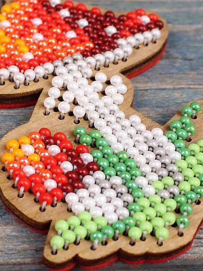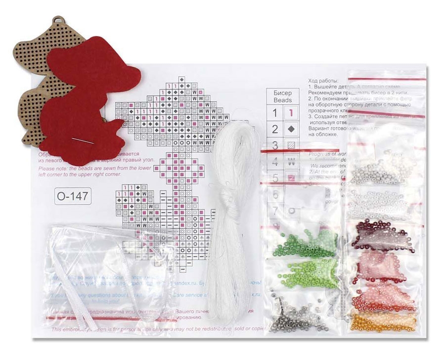 В состав набора входят: перфорированная заготовка (материал - фанера, толщина 4 мм), чешский бисер 9 цветов, фетр для обработки изнаночной стороны, лента, схема, игла, инструкция.