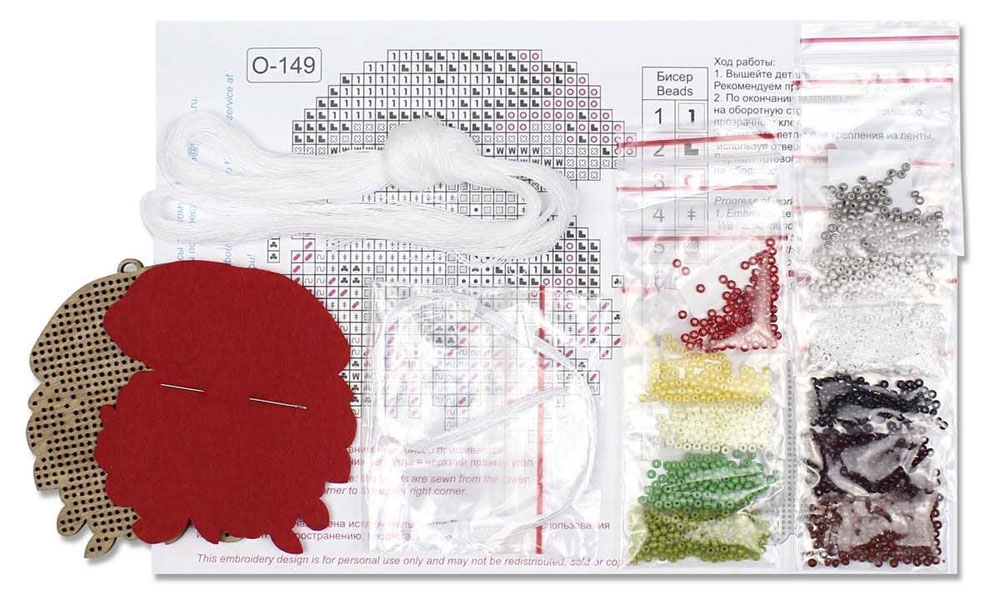 В состав набора входят: перфорированная заготовка (материал - фанера, толщина 4 мм), чешский бисер 11 цветов, фетр для обработки изнаночной стороны, лента, схема, игла, инструкция.