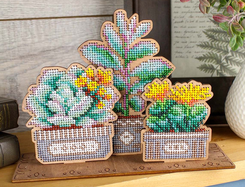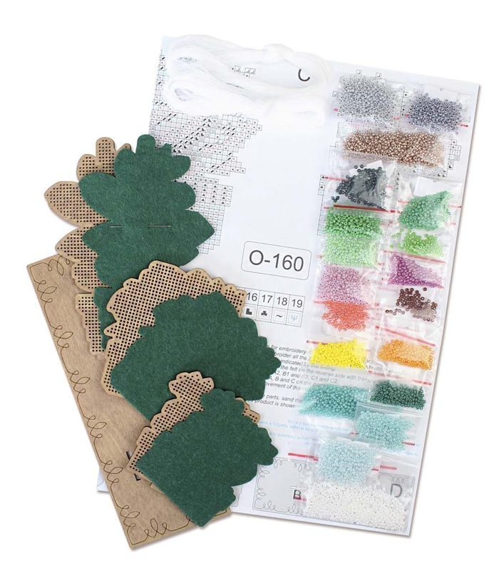 В состав набора входят: перфорированная заготовка (материал - фанера, толщина 4 мм), чешский бисер 19 цветов, фетр для обработки изнаночной стороны, подставка, схема, игла, инструкция.