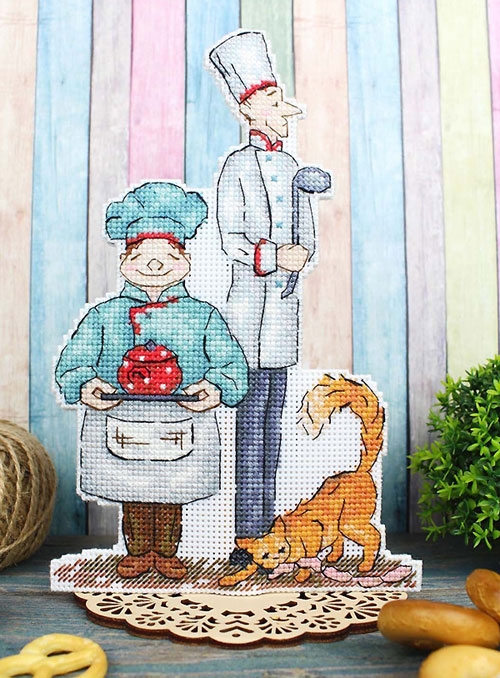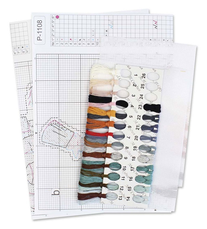 В состав набора входят: нитки мулине ПНК им.Кирова 23 цветов, пластиковая канва белого цвета, игла, схема.