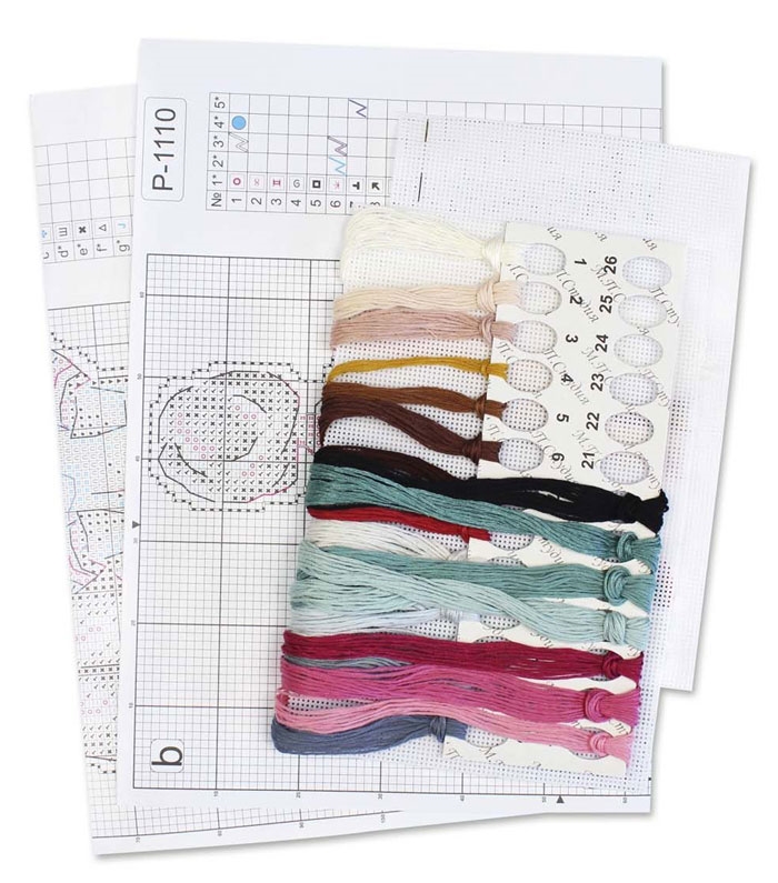 В состав набора входят: нитки мулине ПНК им.Кирова 20 цветов, пластиковая канва белого цвета, игла, схема.