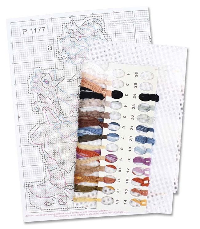 В состав набора входят: нитки мулине ПНК им.Кирова 24 цветов, пластиковая канва белого цвета, игла, схема.