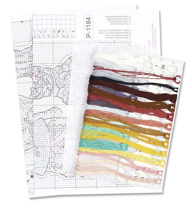 В состав набора входят: нитки мулине ПНК им.Кирова 24 цветов, пластиковая канва белого цвета, нитки металлик, игла, схема.
