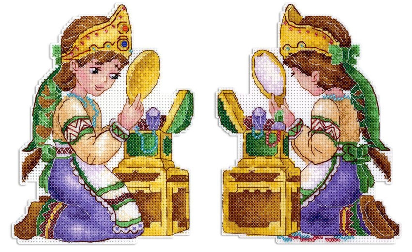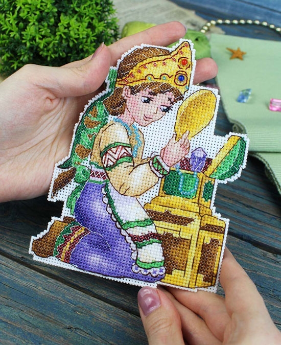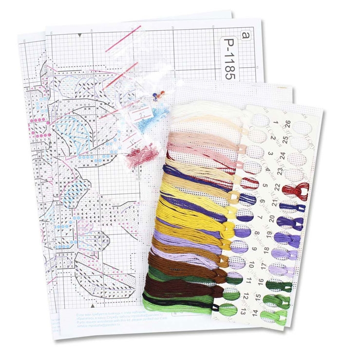 В состав набора входят: нитки мулине ПНК им.Кирова 21 цвета, пластиковая канва белого цвета, нитки металлик, бисер, игла, схема.
