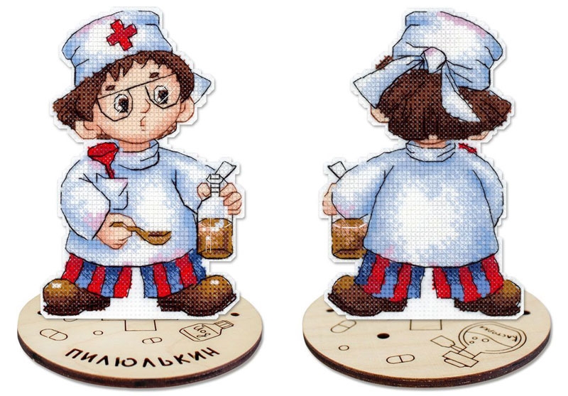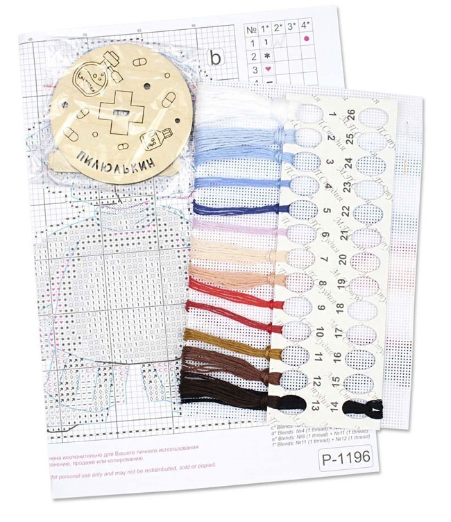 В состав набора входят: нитки мулине ПНК им.Кирова 14 цветов, пластиковая канва белого цвета, деревянная подставка, игла, схема.