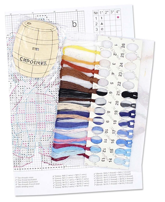 В состав набора входят: нитки мулине ПНК им.Кирова 21 цвета, пластиковая канва белого цвета, деревянная подставка, игла, схема.