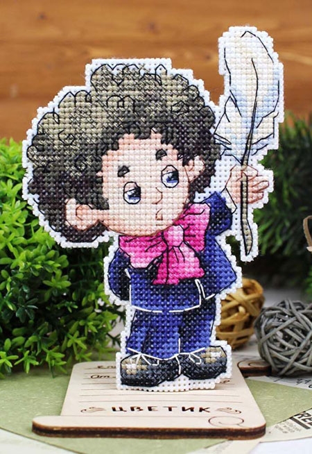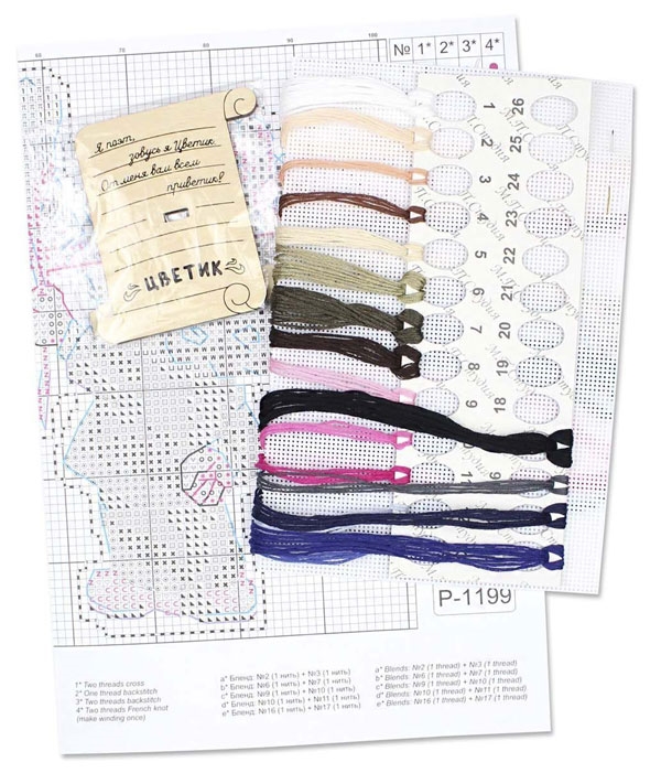 В состав набора входят: нитки мулине ПНК им.Кирова 17 цветов, пластиковая канва белого цвета, деревянная подставка, игла, схема.