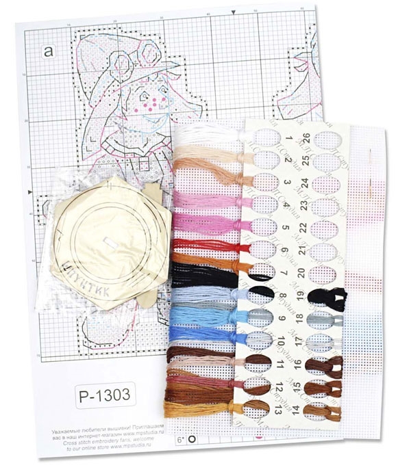 В состав набора входят: нитки мулине ПНК им.Кирова 19 цветов, пластиковая канва белого цвета, деревянная подставка, игла, схема.