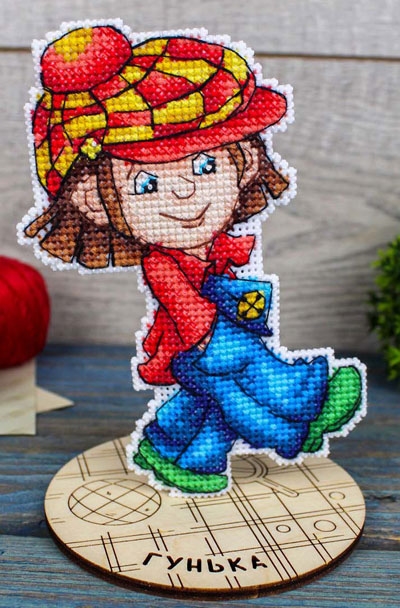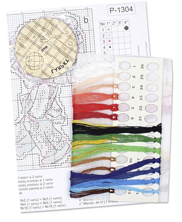 В состав набора входят: нитки мулине ПНК им.Кирова 20 цветов, пластиковая канва белого цвета, деревянная подставка, игла, схема.