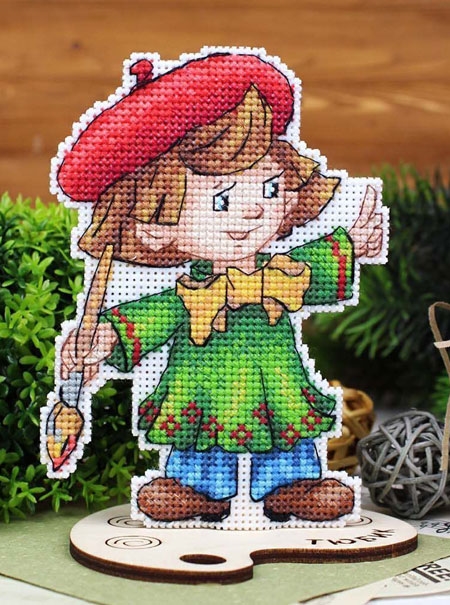 В состав набора входят: нитки мулине ПНК им.Кирова 21 цвета, пластиковая канва белого цвета, деревянная подставка, игла, схема.