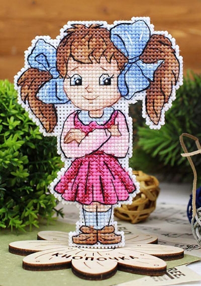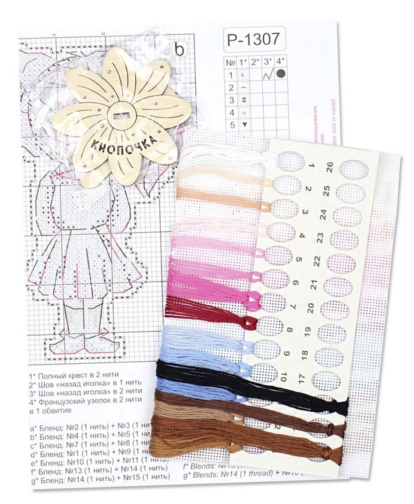 В состав набора входят: нитки мулине ПНК им.Кирова 16 цветов, пластиковая канва белого цвета, деревянная подставка, игла, схема.