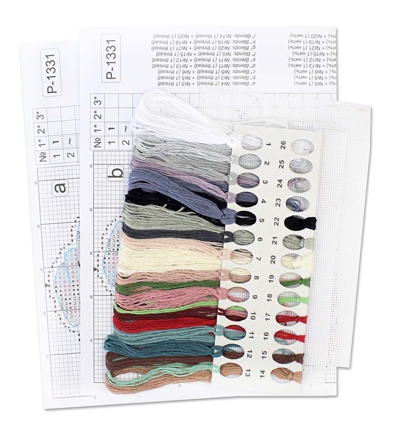В состав набора входят: нитки мулине ПНК им.Кирова 22 цветов, пластиковая канва белого цвета, игла, схема.