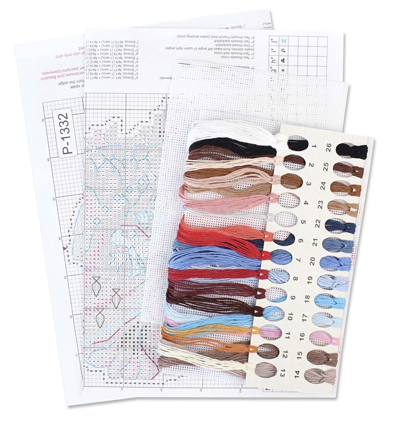В состав набора входят: нитки мулине ПНК им.Кирова 26 цветов, пластиковая канва белого цвета, игла, схема.