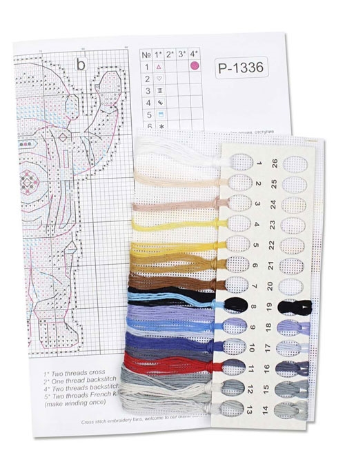 В состав набора входят: нитки мулине ПНК им.Кирова 19 цветов, пластиковая канва белого цвета, игла, схема.