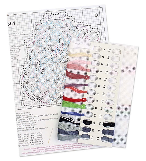 В состав набора входят: нитки мулине ПНК им.Кирова 16 цветов, пластиковая канва белого цвета, игла, схема.