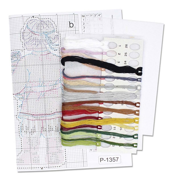 В состав набора входят: нитки мулине ПНК им.Кирова 23 цветов, пластиковая канва белого цвета, игла, схема.