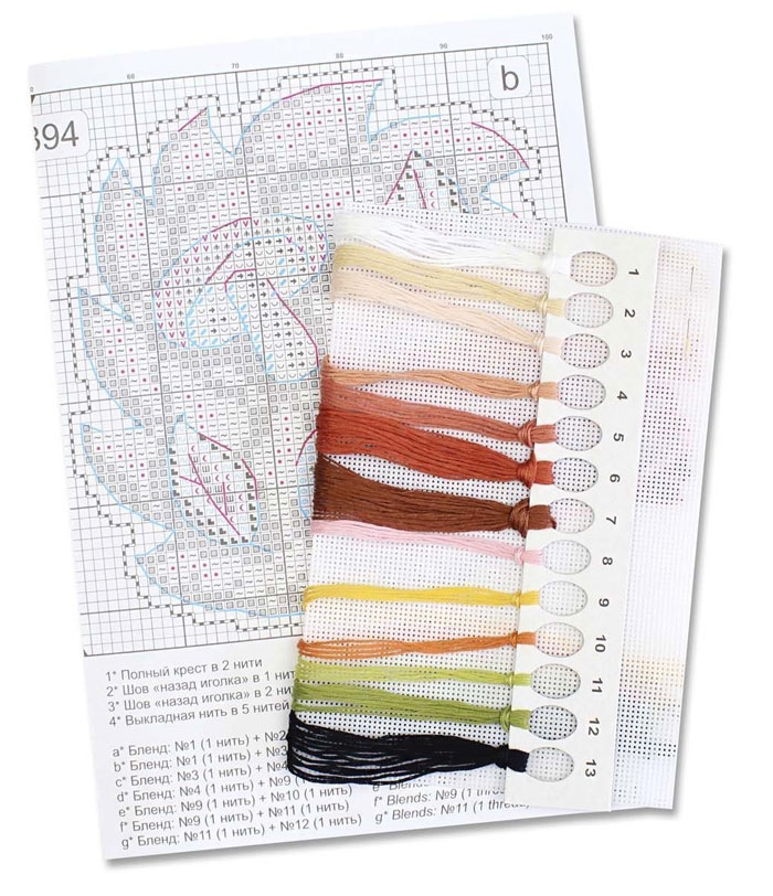 В состав набора входят: нитки мулине ПНК им.Кирова 13 цветов, пластиковая канва белого цвета, игла, схема.