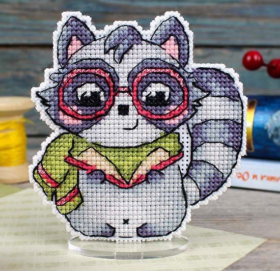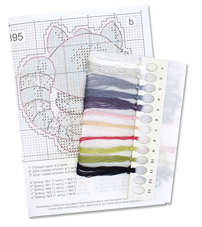 В состав набора входят: нитки мулине ПНК им.Кирова 11 цветов, пластиковая канва белого цвета, игла, схема.