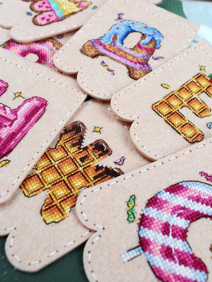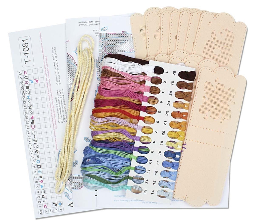 В состав набора входят: перфорированные заготовки из фетра бежевого цвета, мулине ПНК им.Кирова 26 цветов, игла, шнур для развески, схема, инструкция.