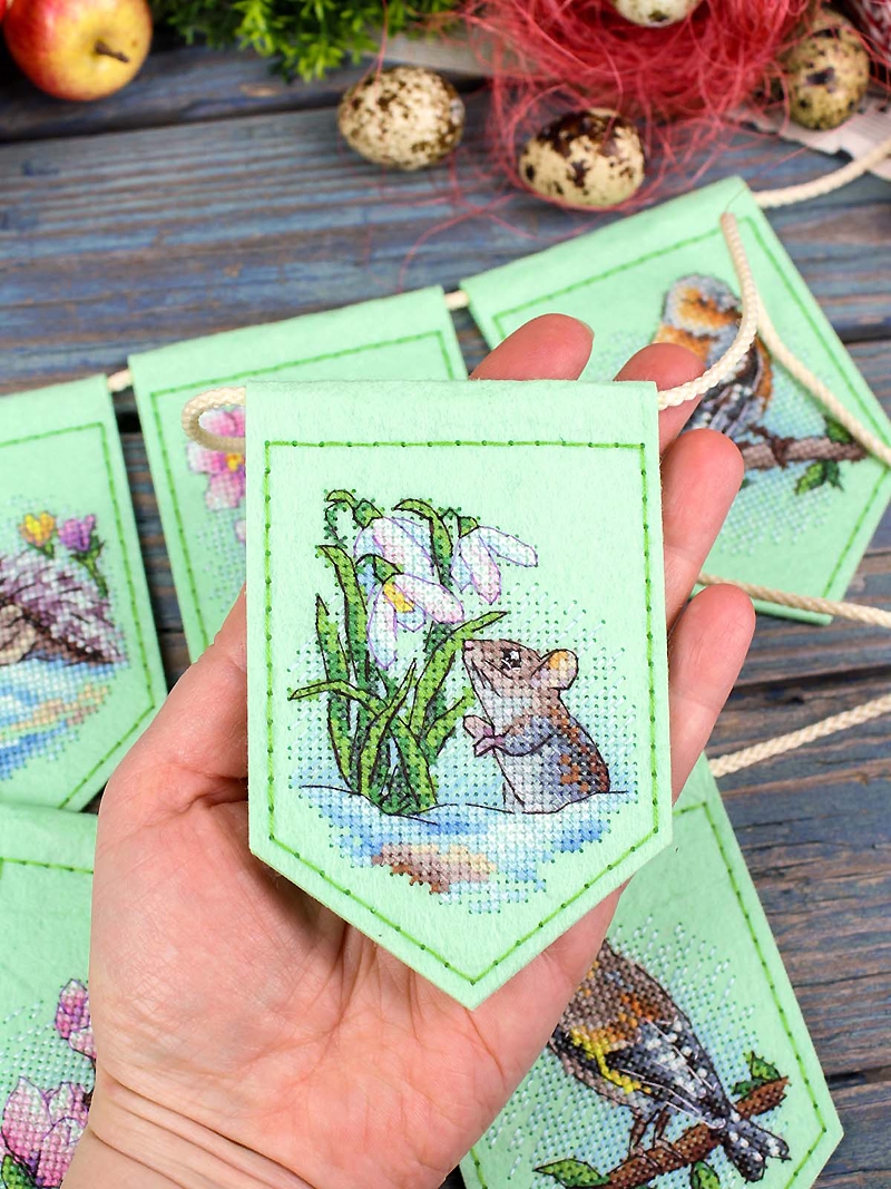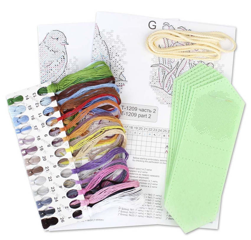 В состав набора входят: перфорированные заготовки из фетра светло-зеленого цвета, мулине ПНК им.Кирова 26 цветов, игла, шнур для развески, схема, инструкция.